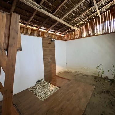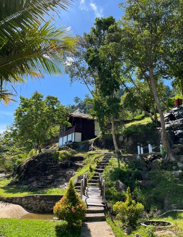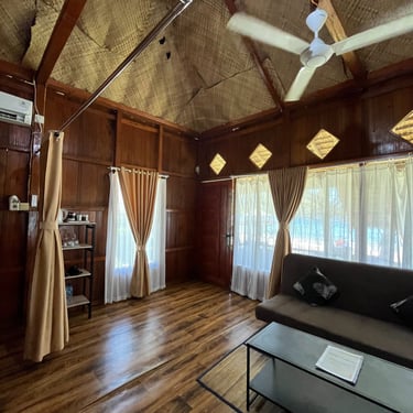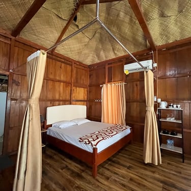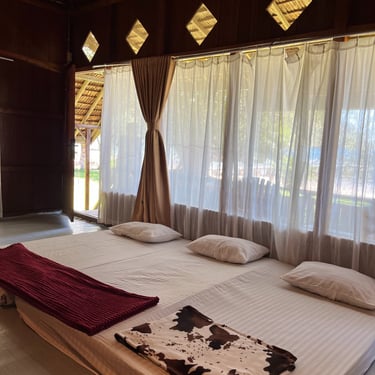 Desain Tradisional & Natural: Bangunan kayu dan atap rumbia memberi nuansa asri dan ramah alam.