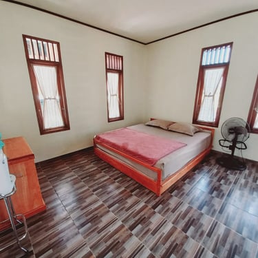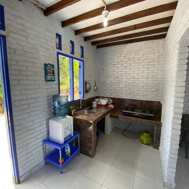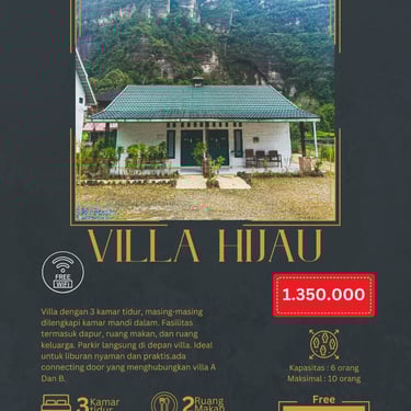 Setiap villa di Yuwan Villa dilengkapi dengan fasilitas modern untuk memastikan kenyamanan maksimal selama menginap: Fasilitas di Dalam Villa: - 3 Kamar tidur dengan kasur nyaman dan sprei bersih - Kamar mandi dalam dengan air panas (untuk Villa Merah, Hijau, dan Biru) - Dapur lengkap dengan kompor, peralatan masak, dan kitchen set - Ruang makan dengan meja dan kursi - Ruang keluarga dengan sofa yang nyaman - TV untuk hiburan keluarga - WiFi gratis (terbatas, disesuaikan dengan signal area) Fasilitas Tambahan: - Area parkir luas di depan setiap villa - Teras untuk bersantai dan menikmati pemandangan - BBQ set (tersedia dengan biaya tambahan) - Laundry service (tersedia dengan biaya tambahan) Catatan: Cottage Puti belum dilengkapi dengan AC, namun udara Lembah Harau yang sejuk dan dingin di malam hari membuat AC tidak terlalu diperlukan. Suhu di malam hari berkisar 18-22°C, sangat nyaman untuk tidur.